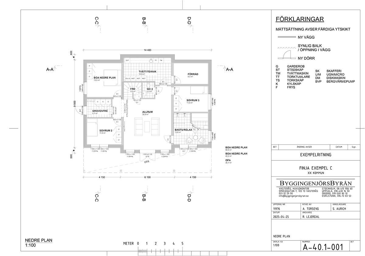 Till grunden används Finja Exakt-element som bryter köldbryggan med en färdig utsida av borstad betong. Som grundisolering används cellplast från Finja Betong.