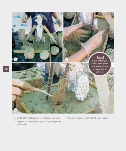 5 Stötta nätet med två reglar som säkras upp av vikter. 7 Betongen trycks in i nätet med hjälp av en spatel.